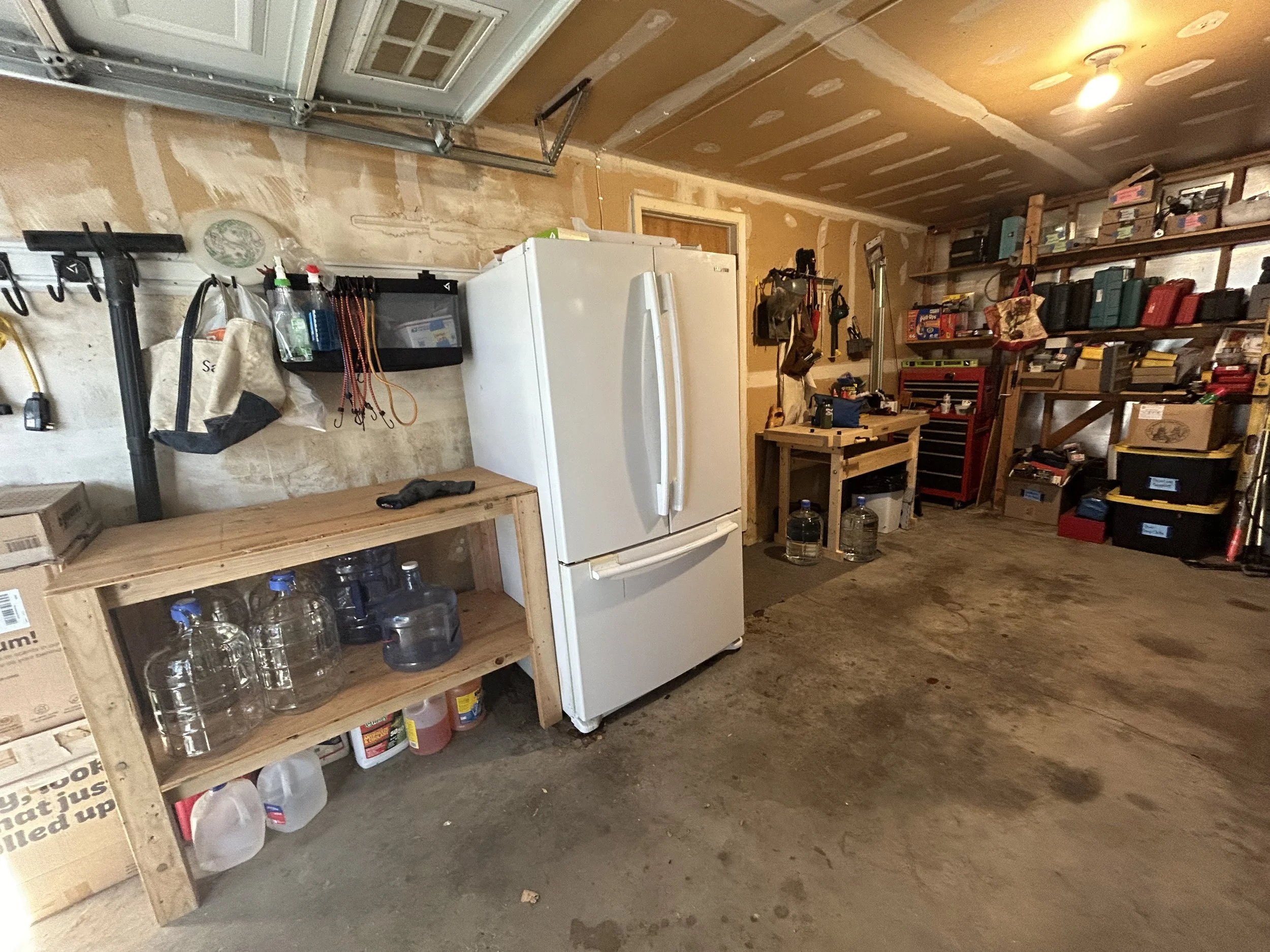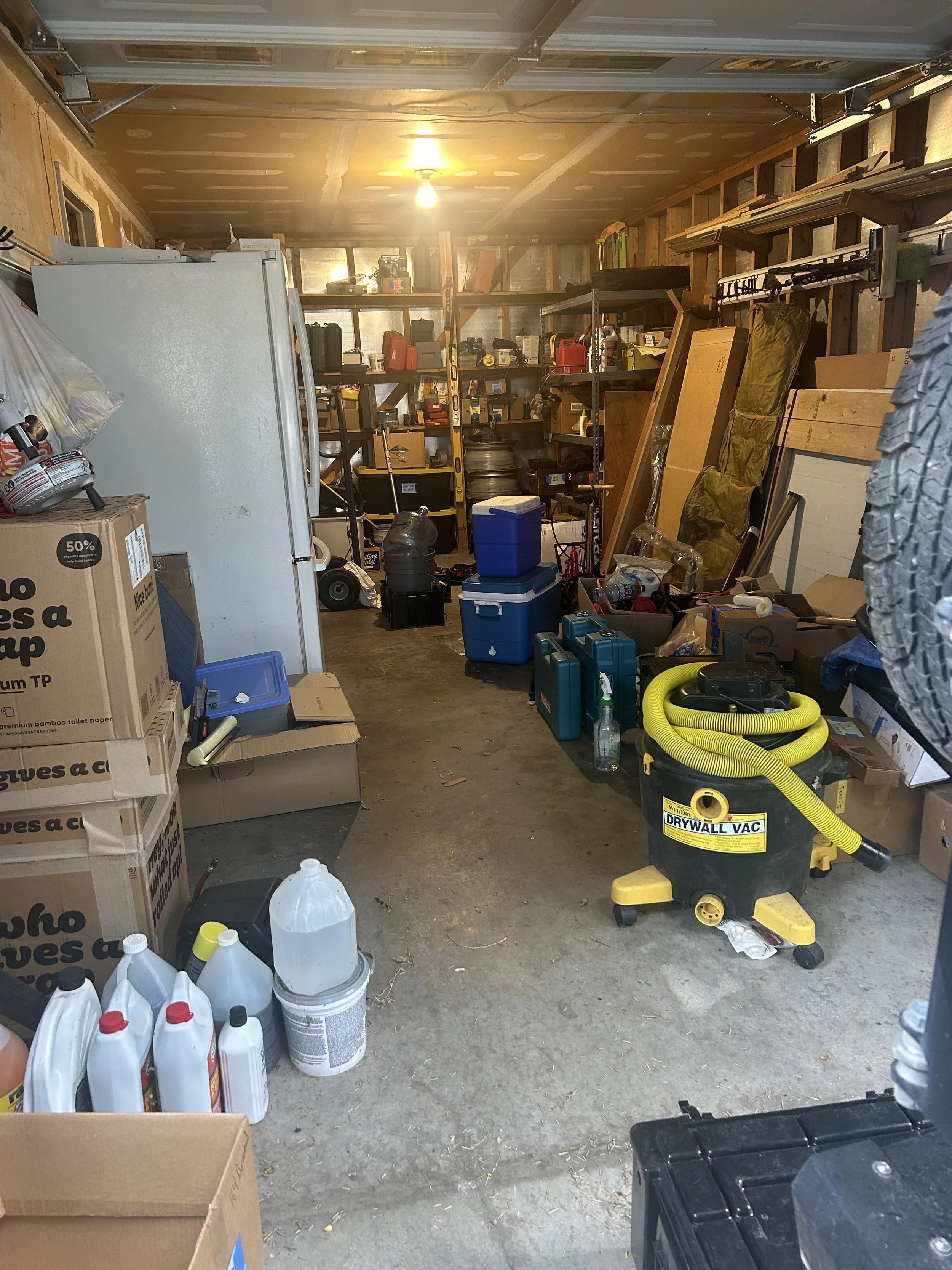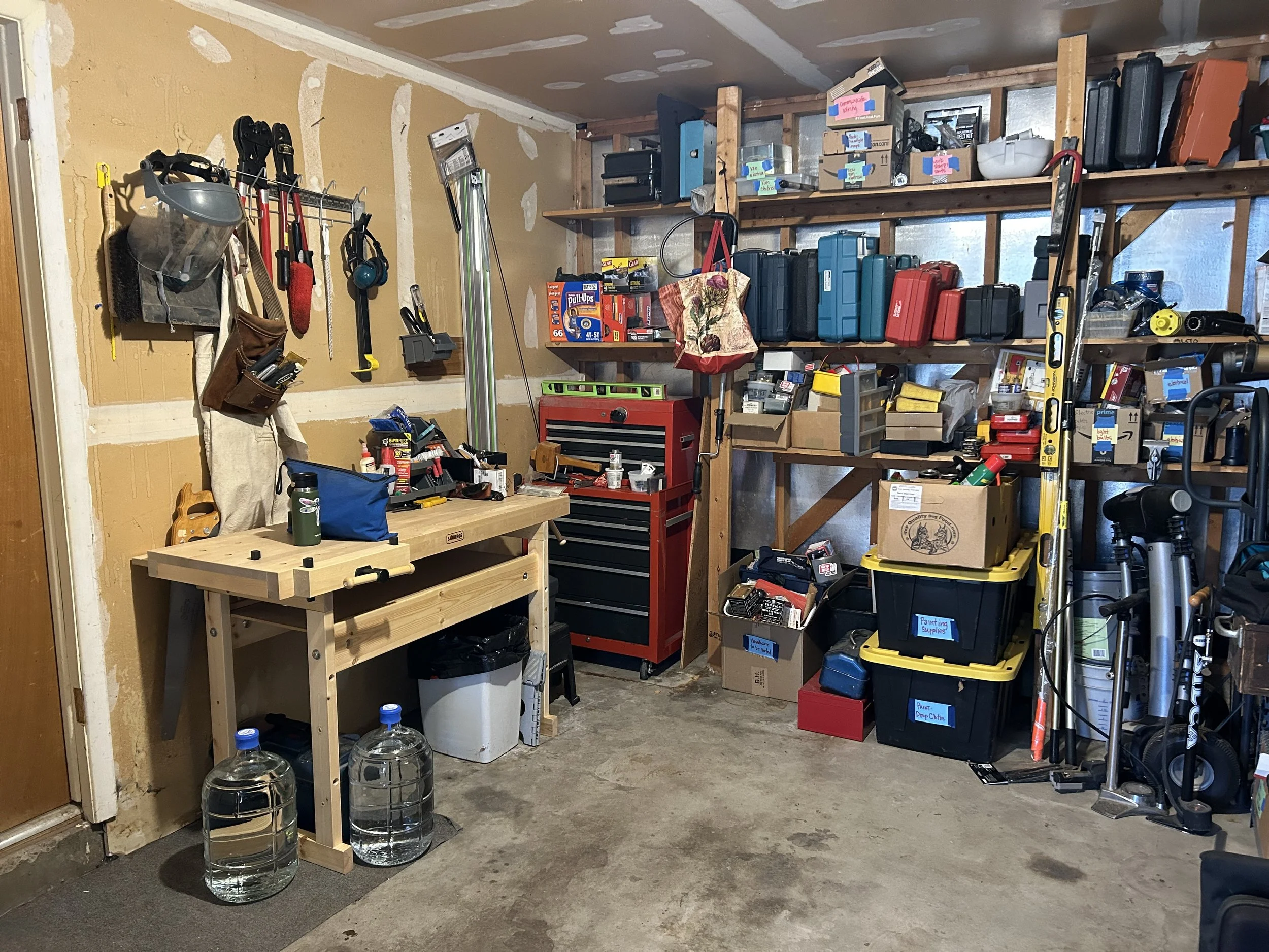 After living in this home for over 20 years without adequate staging tables in the garage, life changes prompted a fresh beginning for this older client. After losing his beloved wife and then approaching a serious surgery that would limit how he would get around, we made the case for table-height surfaces with which to stage and process all the things that usually ended up on the garage floor. We unearthed a most excellent work bench that needed to be assembled, and built two work tables from existing lumber, for better flow in and out of the house, as well as processing camping road trips out of the classic VW van. Lots of tools, gear, and household supplies that have long been shuffled from one chaotic pile to the next (never knowing where anything really was). Our next phase will tackle the shed, to better organize yard equipment and sports gear, once the surgery heals and weather is warm again. Also more refinement and organization of tools, once a deeper assessment of what’s still relevant can be made.