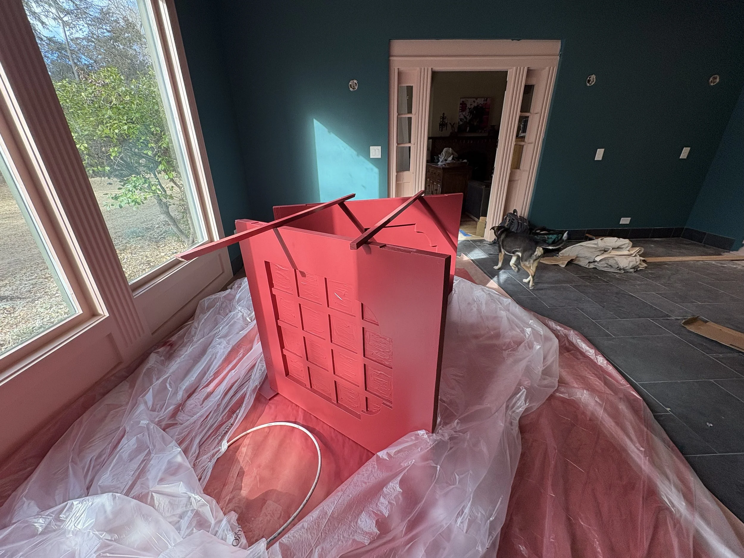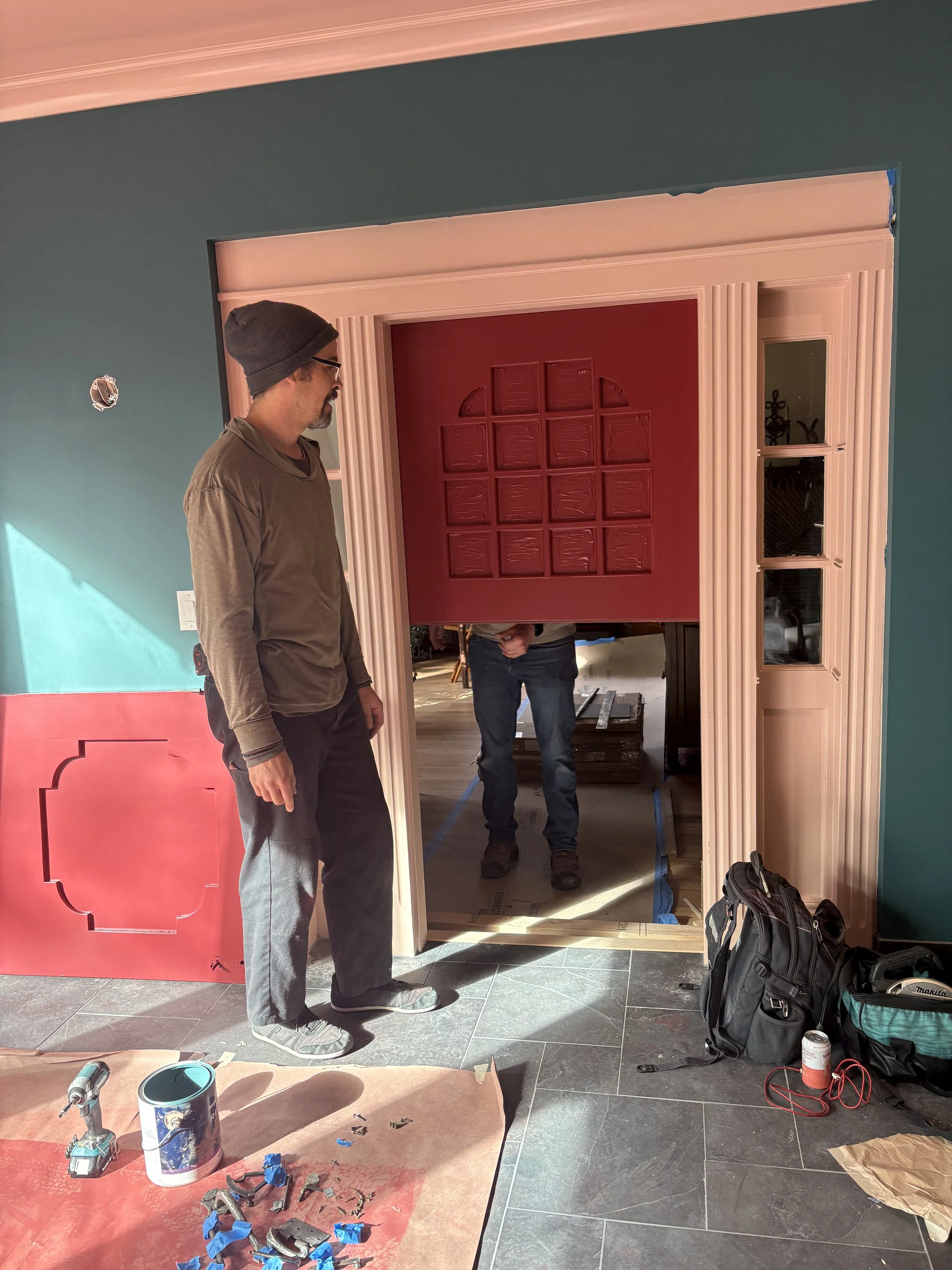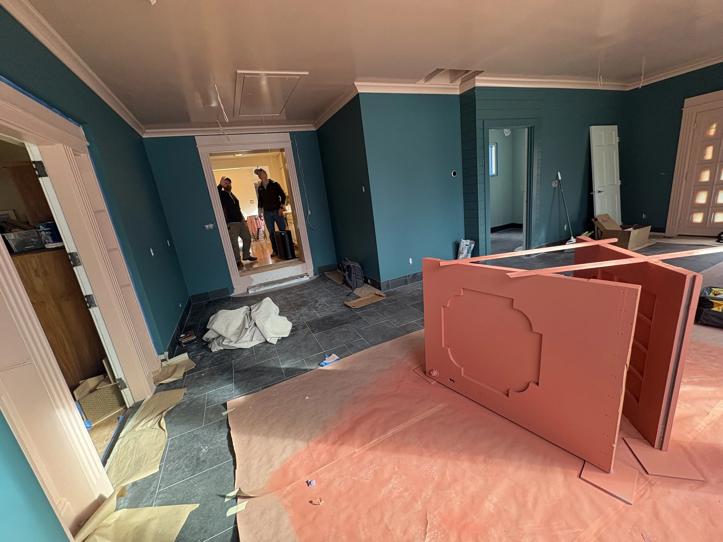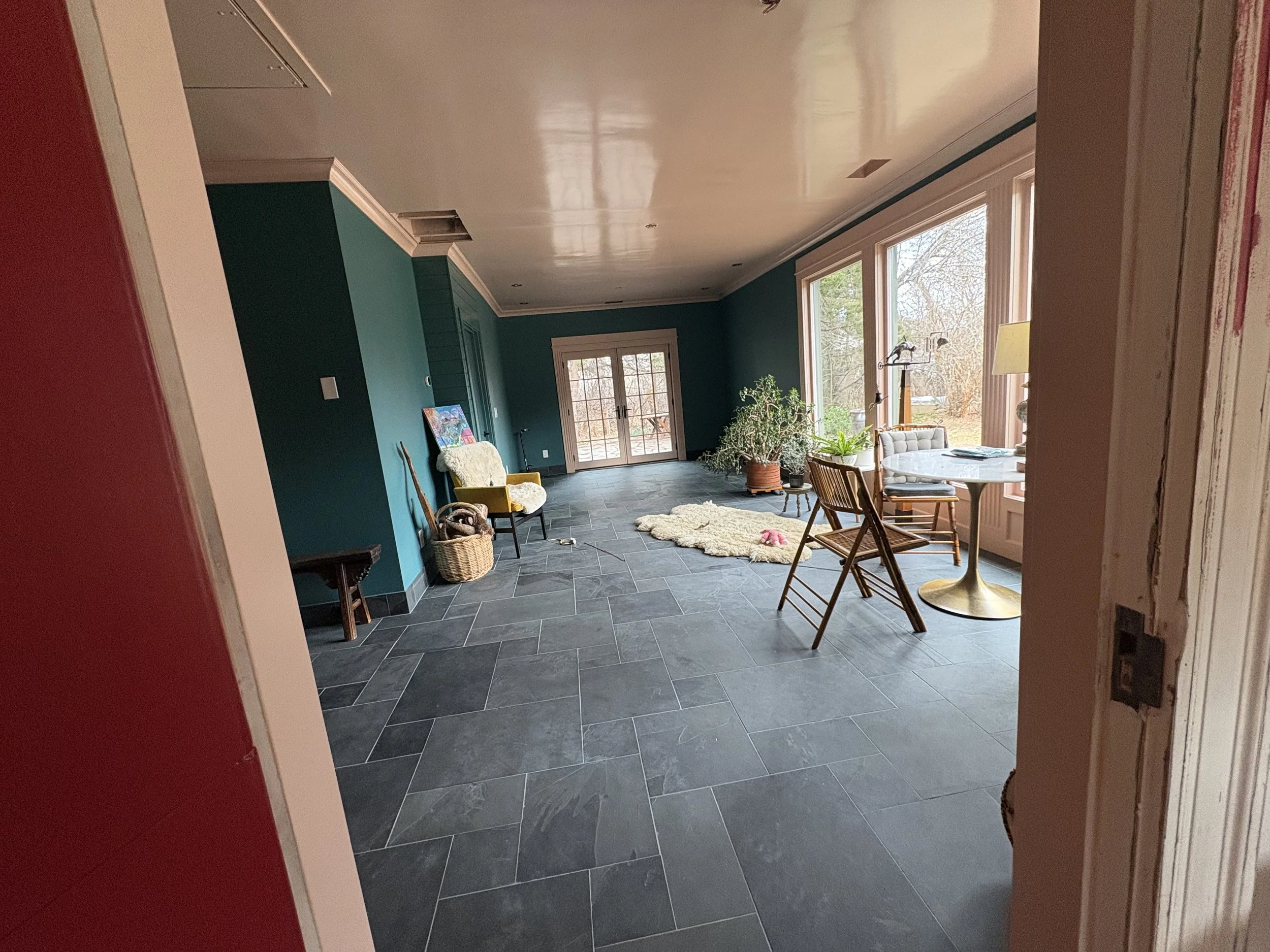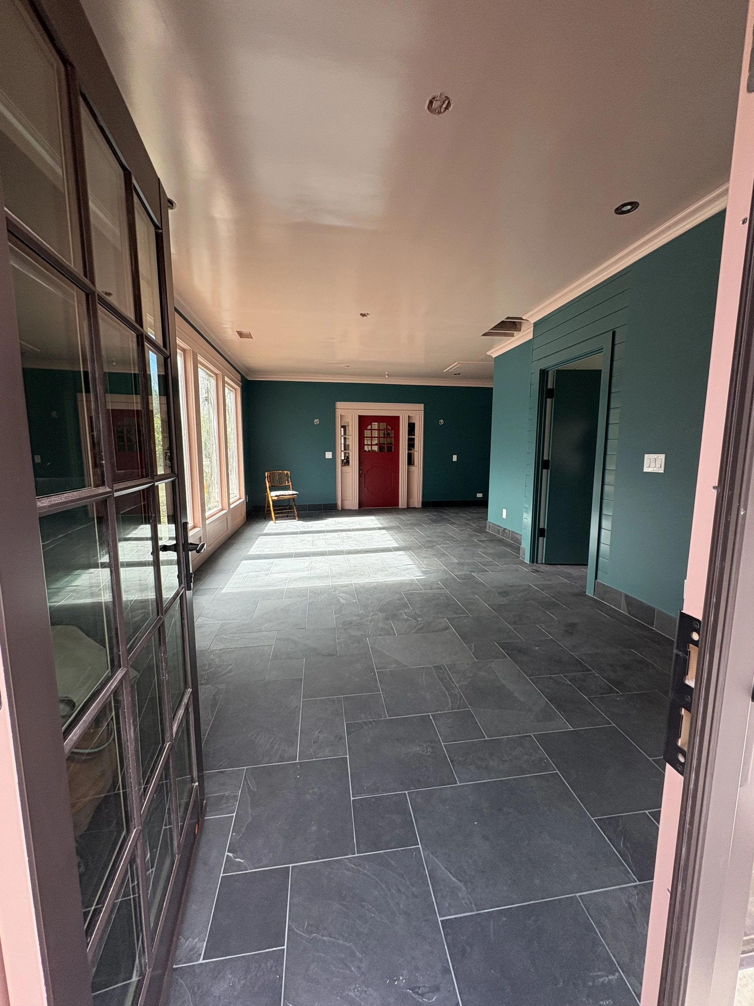 Once we sorted out the tile (about a month before breaking ground; we needed that time for it to ship!), we took our time figuring out the colors. The walls went darker than initially expected (SW Rookwood Sash Green 2810), and we elevated the trim color (BM Chippendale Rosetone HC-58) with a high gloss sheen on the crown moulding and ceiling, for added contrast and reflectivity against the dark surfaces of walls and floor. The adjacent office and bath were colored-drenched (walls, ceiling, trim, doors) in a lighter, mint tone (BM Blue Grass CC-640). Additional trim was added throughout the main sunroom, to elevate the ceiling transition and to echo the fluted, historic trim around the period barn door - which was the last color to figure out, and took us a few tries to get it right (SW Beetroot 9695). Ultimately Mya took in a small rug from the home and found its best companion color… and it ties in both sunroom and great room, especially the way they are furnished with textiles with this deep and saturated red range.