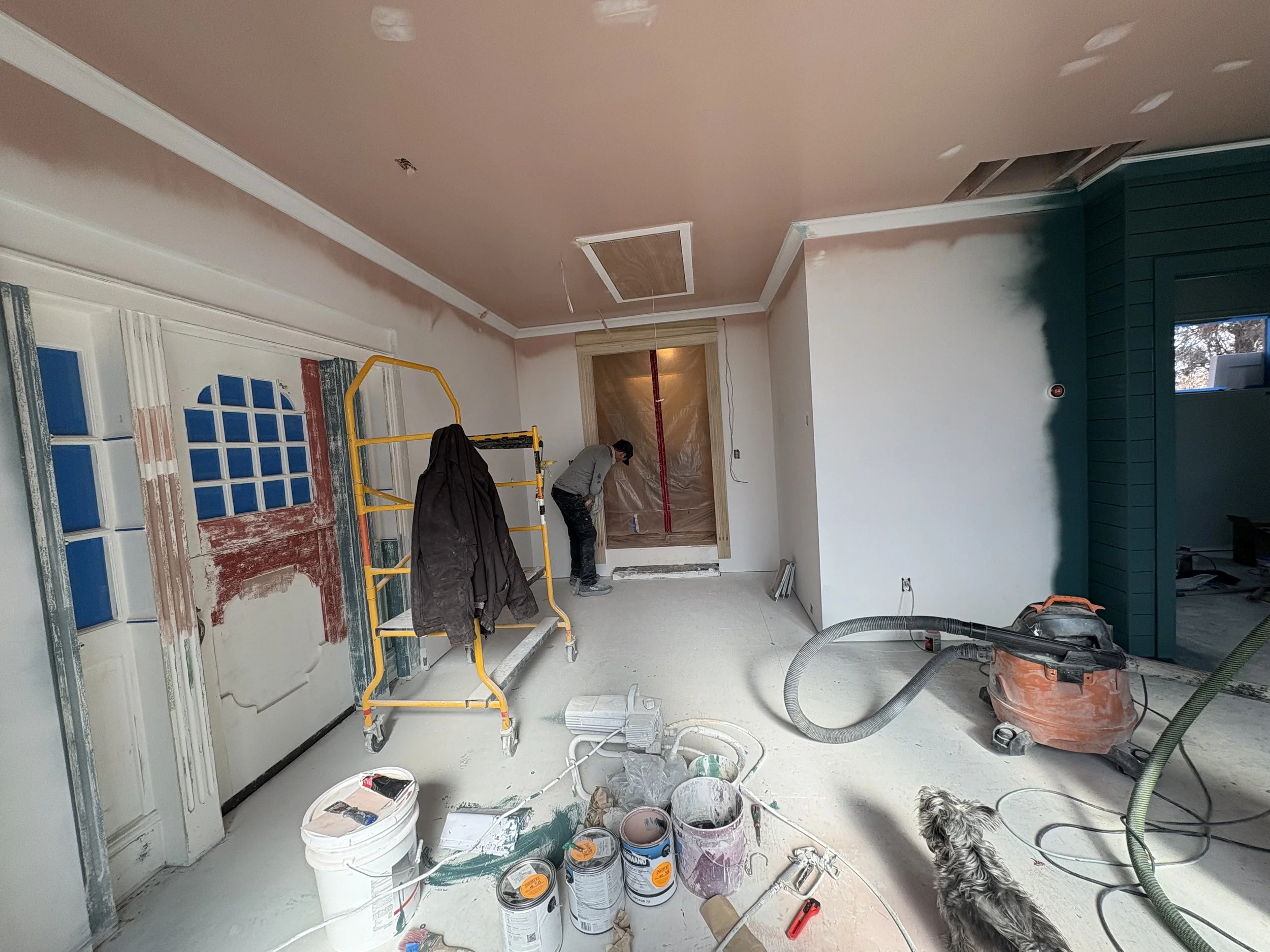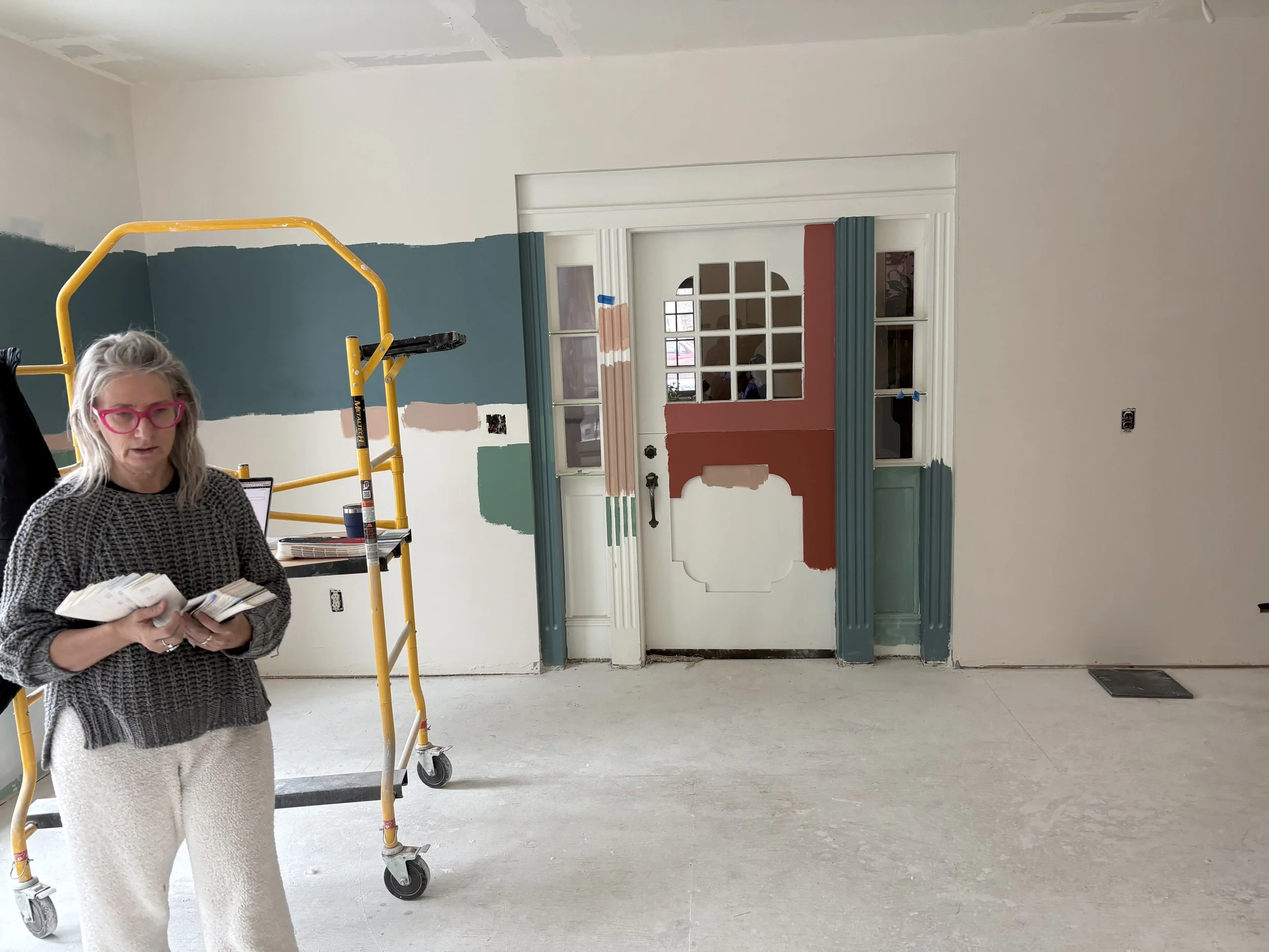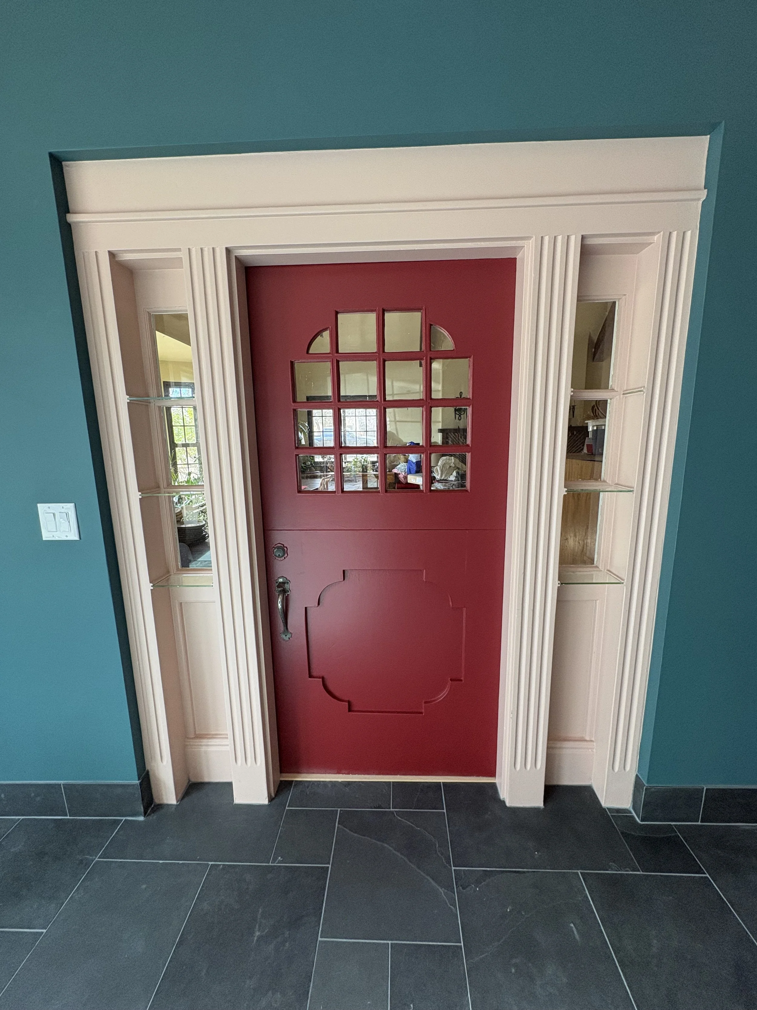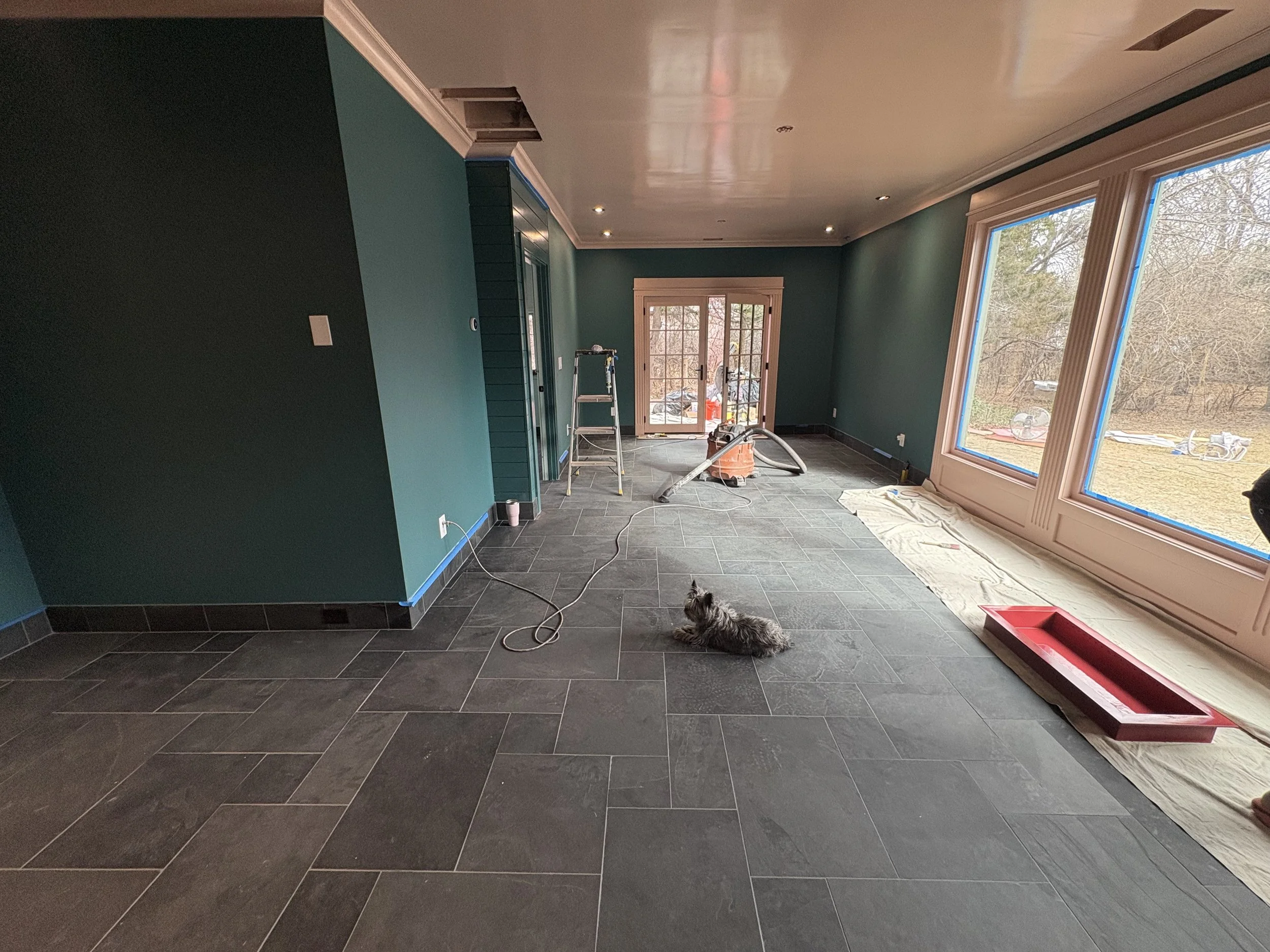 Once we sorted out the tile (about a month before breaking ground; we needed that time for it to ship!), we took our time figuring out the colors. The walls went darker than initially expected (SW Rookwood Sash Green 2810), and we elevated the trim color (BM Chippendale Rosetone HC-58) with a high gloss sheen on the crown moulding and ceiling, for added contrast and reflectivity against the dark surfaces of walls and floor. The adjacent office and bath were colored-drenched (walls, ceiling, trim, doors) in a lighter, mint tone (BM Blue Grass CC-640). Additional trim was added throughout the main sunroom, to elevate the ceiling transition and to echo the fluted, historic trim around the period barn door - which was the last color to figure out, and took us a few tries to get it right (SW Beetroot 9695). Ultimately Mya took in a small rug from the home and found its best companion color… and it ties in both sunroom and great room, especially the way they are furnished with textiles with this deep and saturated red range.