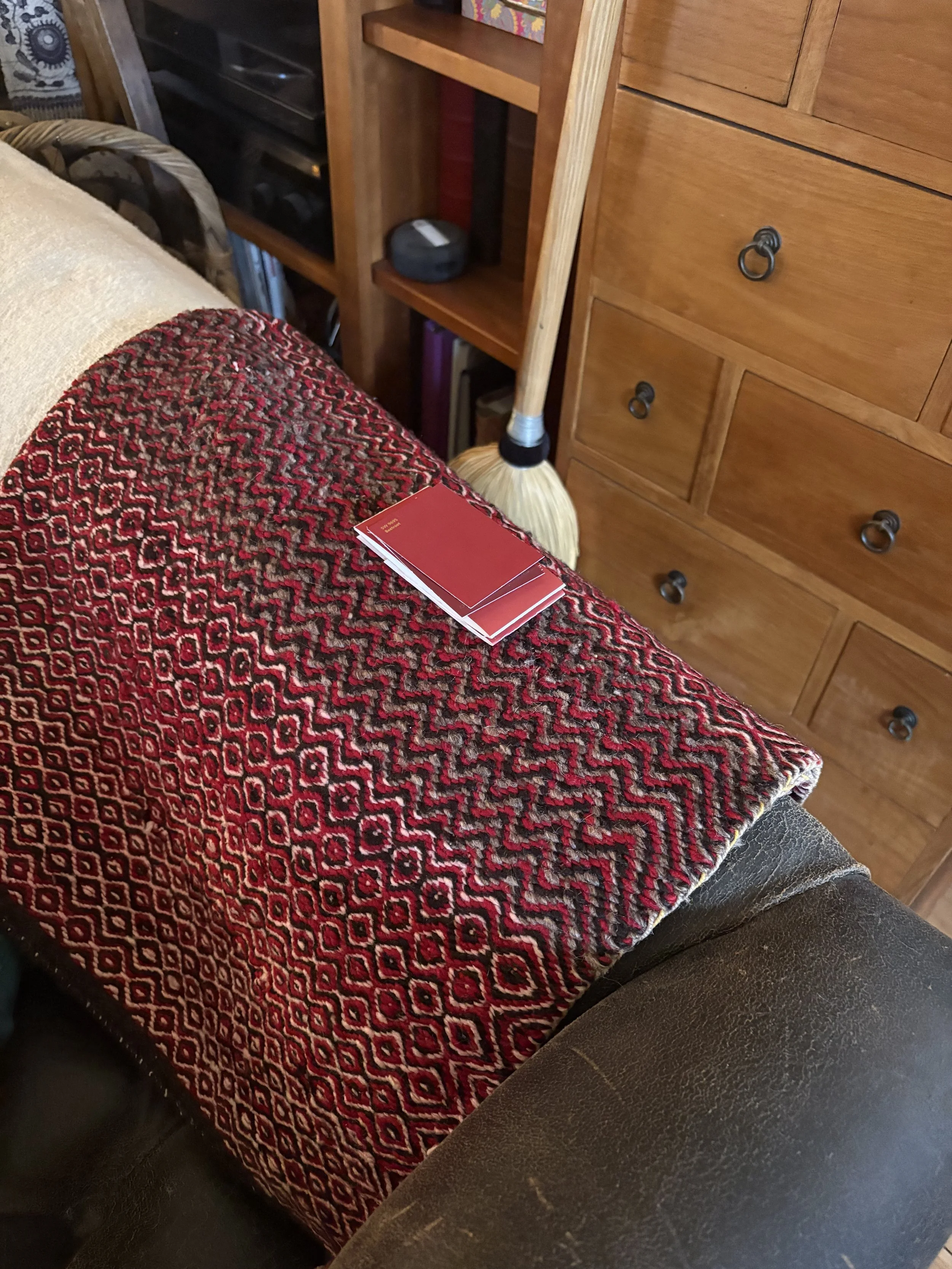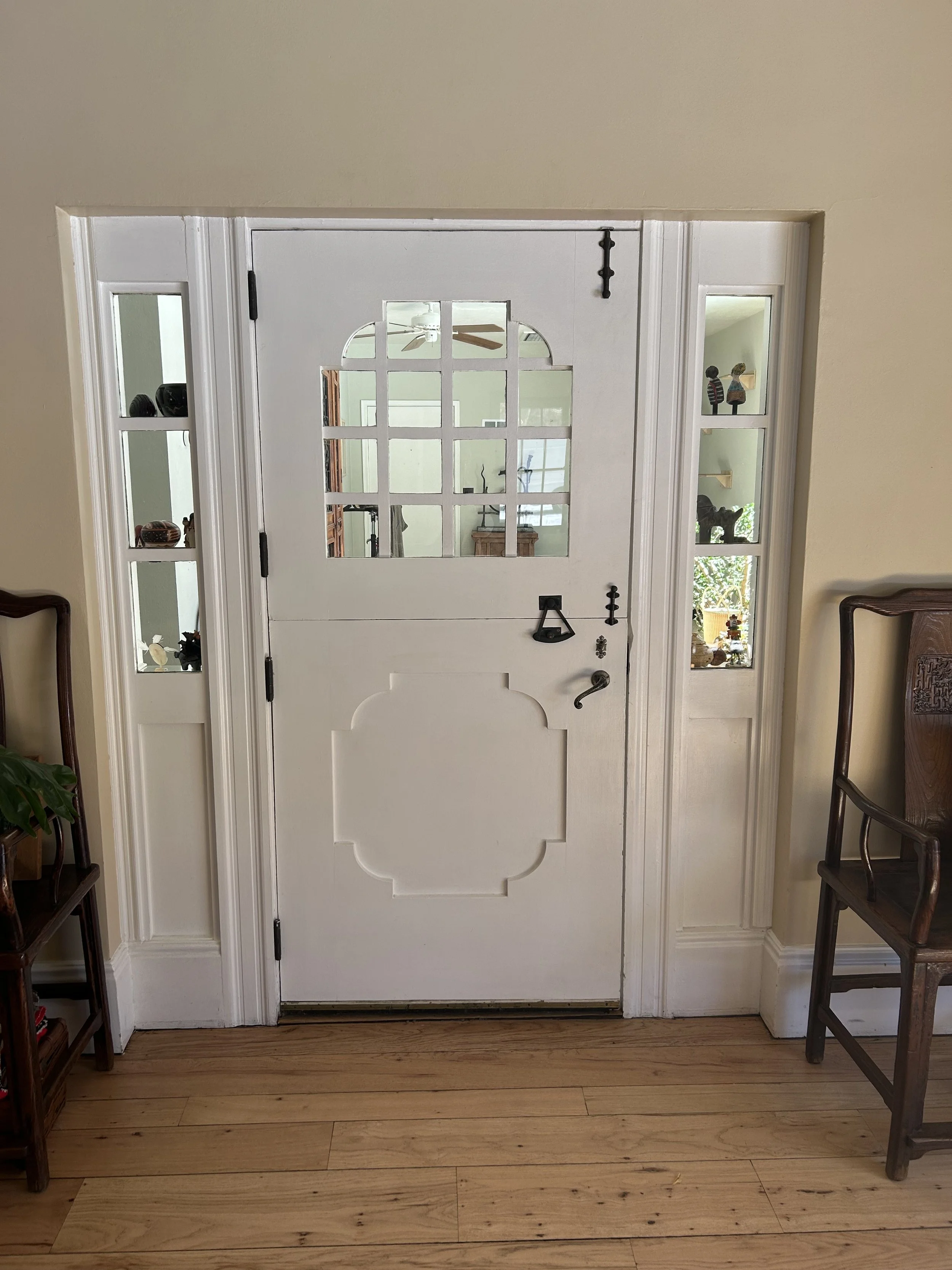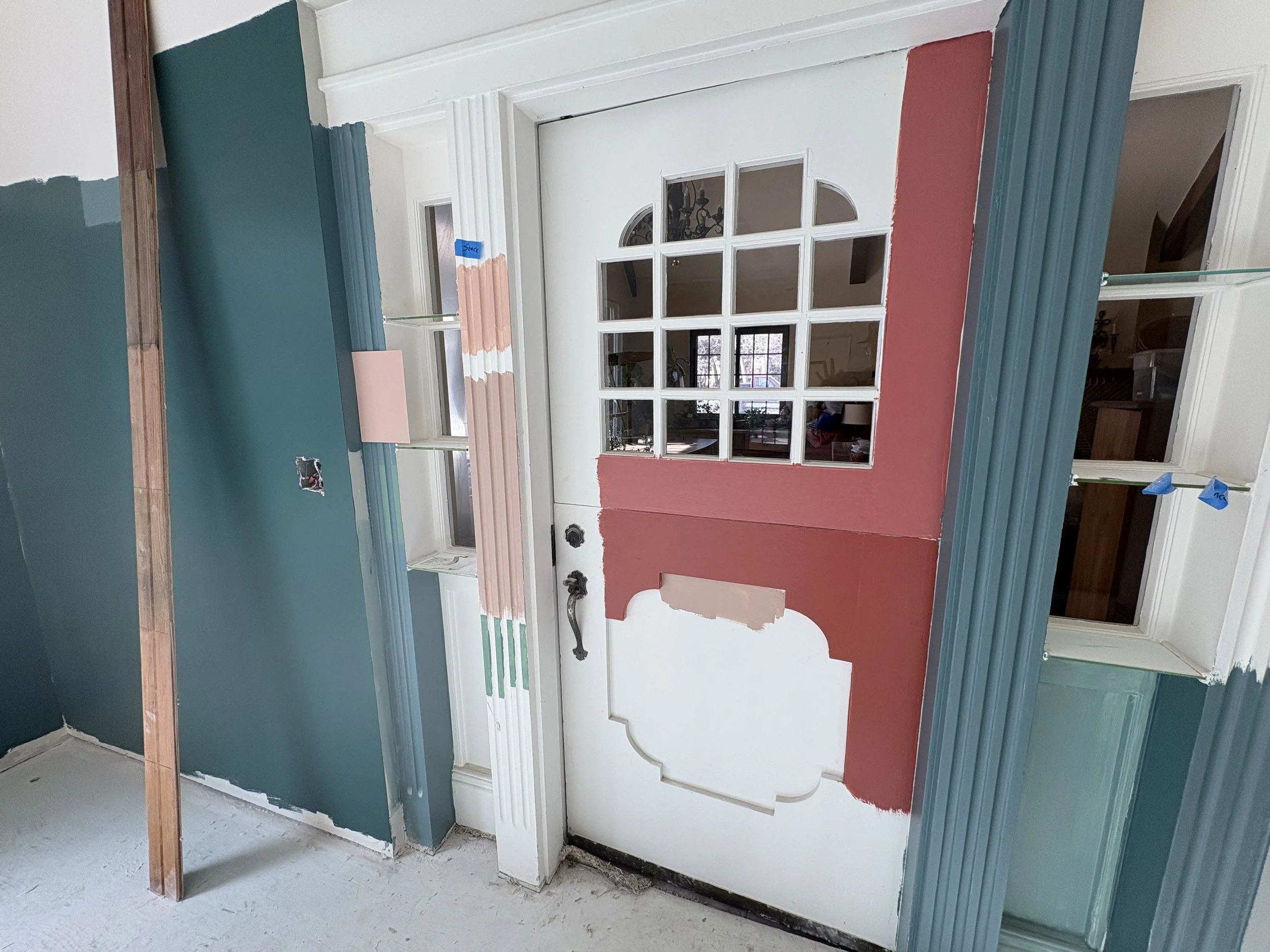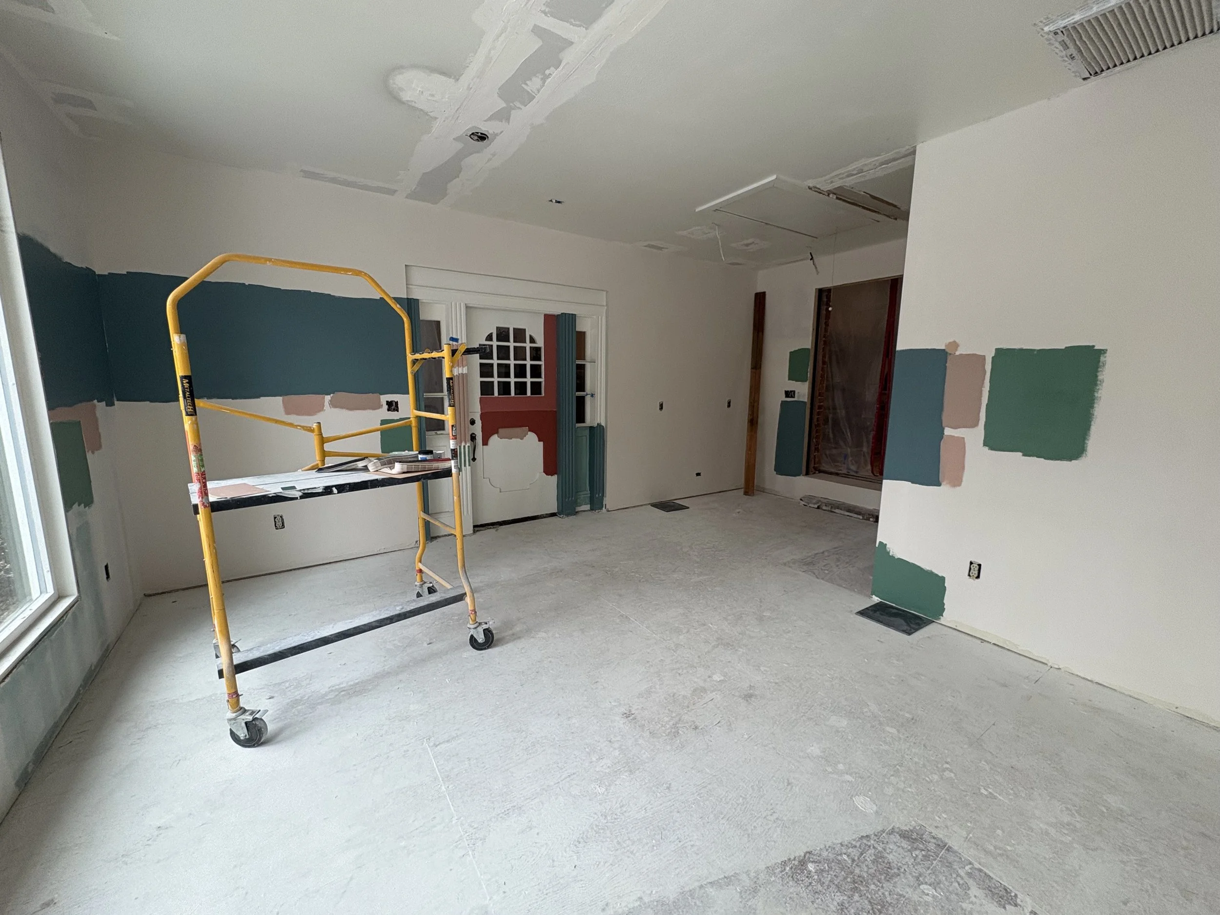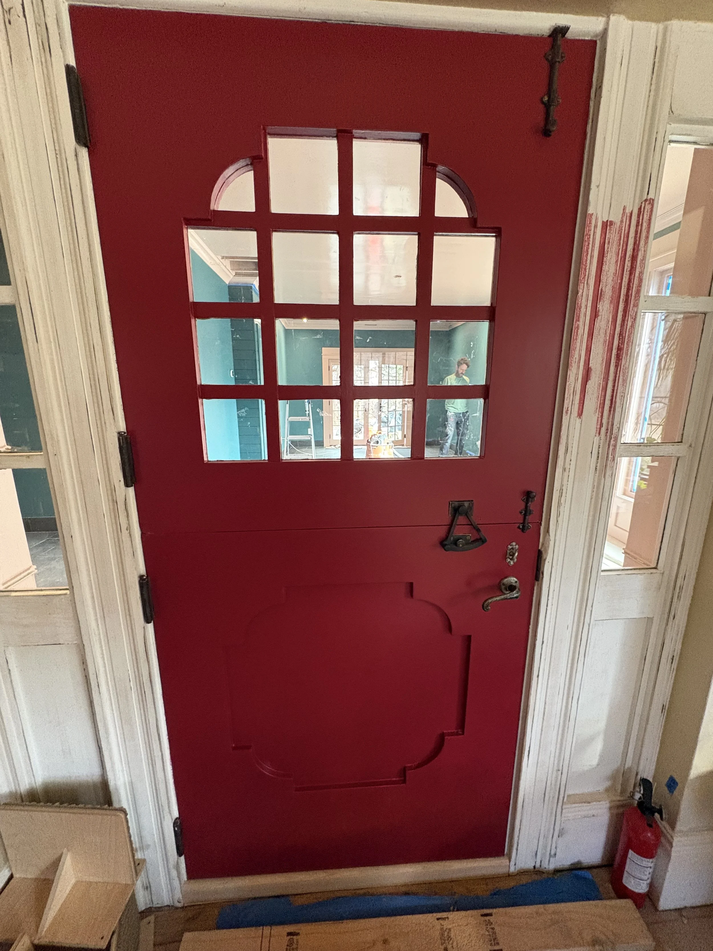 Once we sorted out the tile (about a month before breaking ground; we needed that time for it to ship!), we took our time figuring out the colors. The walls went darker than initially expected (SW Rookwood Sash Green 2810), and we elevated the trim color (BM Chippendale Rosetone HC-58) with a high gloss sheen on the crown moulding and ceiling, for added contrast and reflectivity against the dark surfaces of walls and floor. The adjacent office and bath were colored-drenched (walls, ceiling, trim, doors) in a lighter, mint tone (BM Blue Grass CC-640). Additional trim was added throughout the main sunroom, to elevate the ceiling transition and to echo the fluted, historic trim around the period barn door - which was the last color to figure out, and took us a few tries to get it right (SW Beetroot 9695). Ultimately Mya took in a small rug from the home and found its best companion color… and it ties in both sunroom and great room, especially the way they are furnished with textiles with this deep and saturated red range.