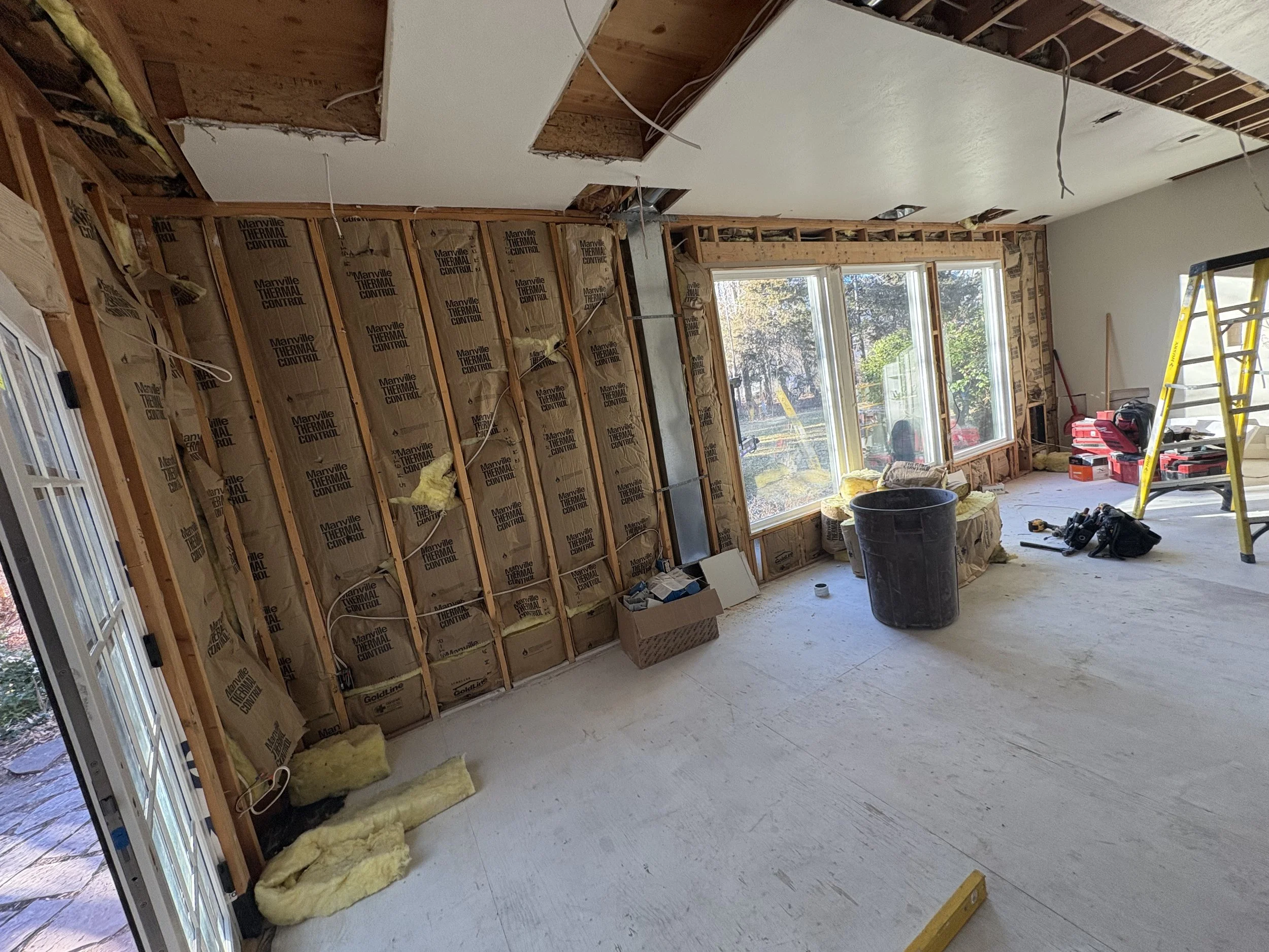 Some structural adjustments were made, once we got demo underway and could see what was happening under-the-hood: better HVAC ducting in the attic, and repositioning the vents to allow for crown moulding to be added. Electrical needed to be deleted, updated, and increased. Pantry deleted and plumbing/plumbing-chase were made more civilized, and gained us a little square footage. Attic stair unit was replaced b/c it was old and could stand to be more robust. We opened up the space in two key ways: cutting a much wider opening for an exterior French door on the East wall (previously no windows and only a small man-door), and widening the passage between the sunroom and kitchen by cutting through what used to be a thick, brick exterior wall. Hopes of finding a good, used French door were futile, so a new/quality one had to be ordered with enough lead time, about 8 weeks. Our project start date depended on when those doors would arrive, and also, tile. Which can be easy — or careful.