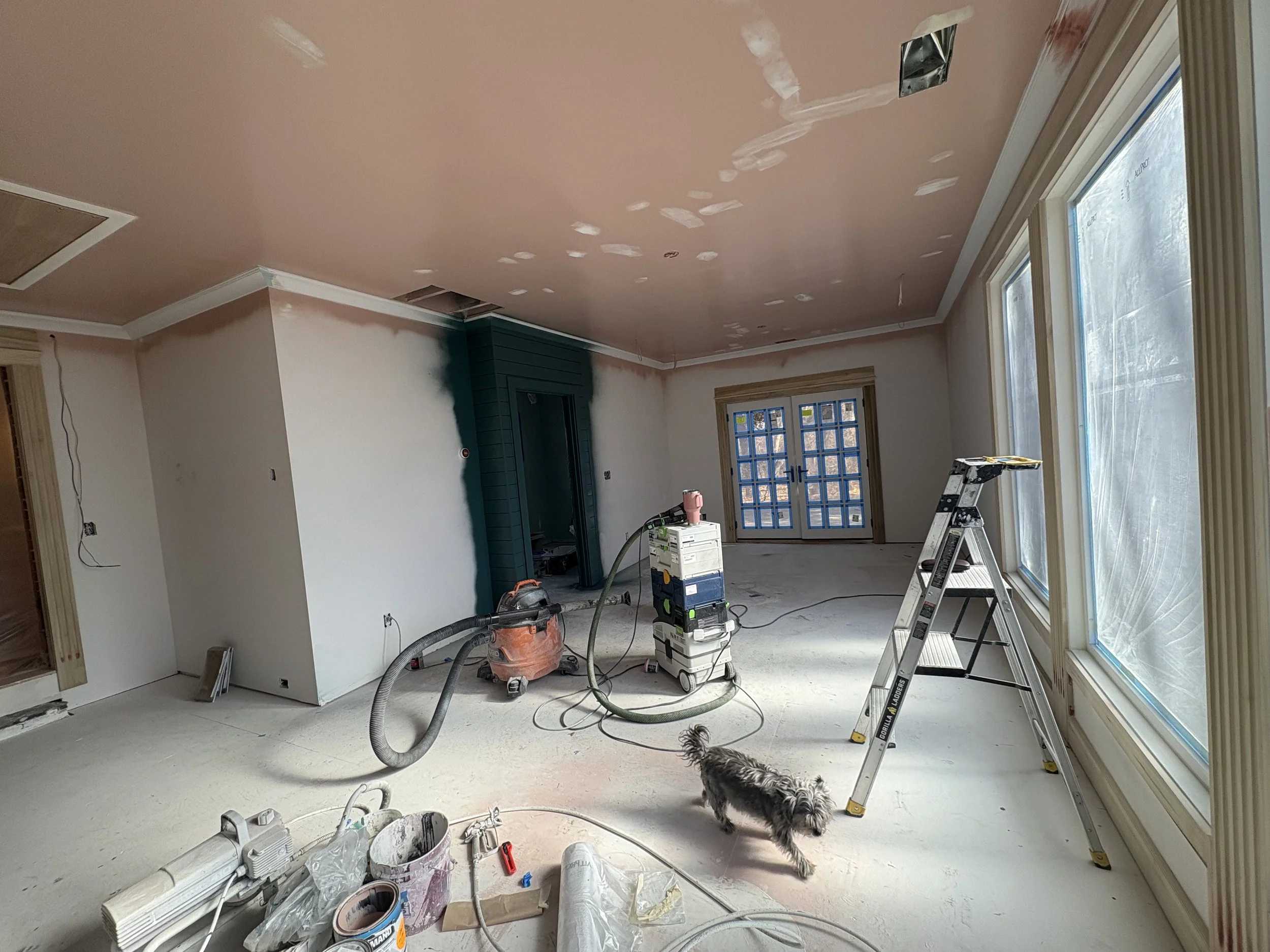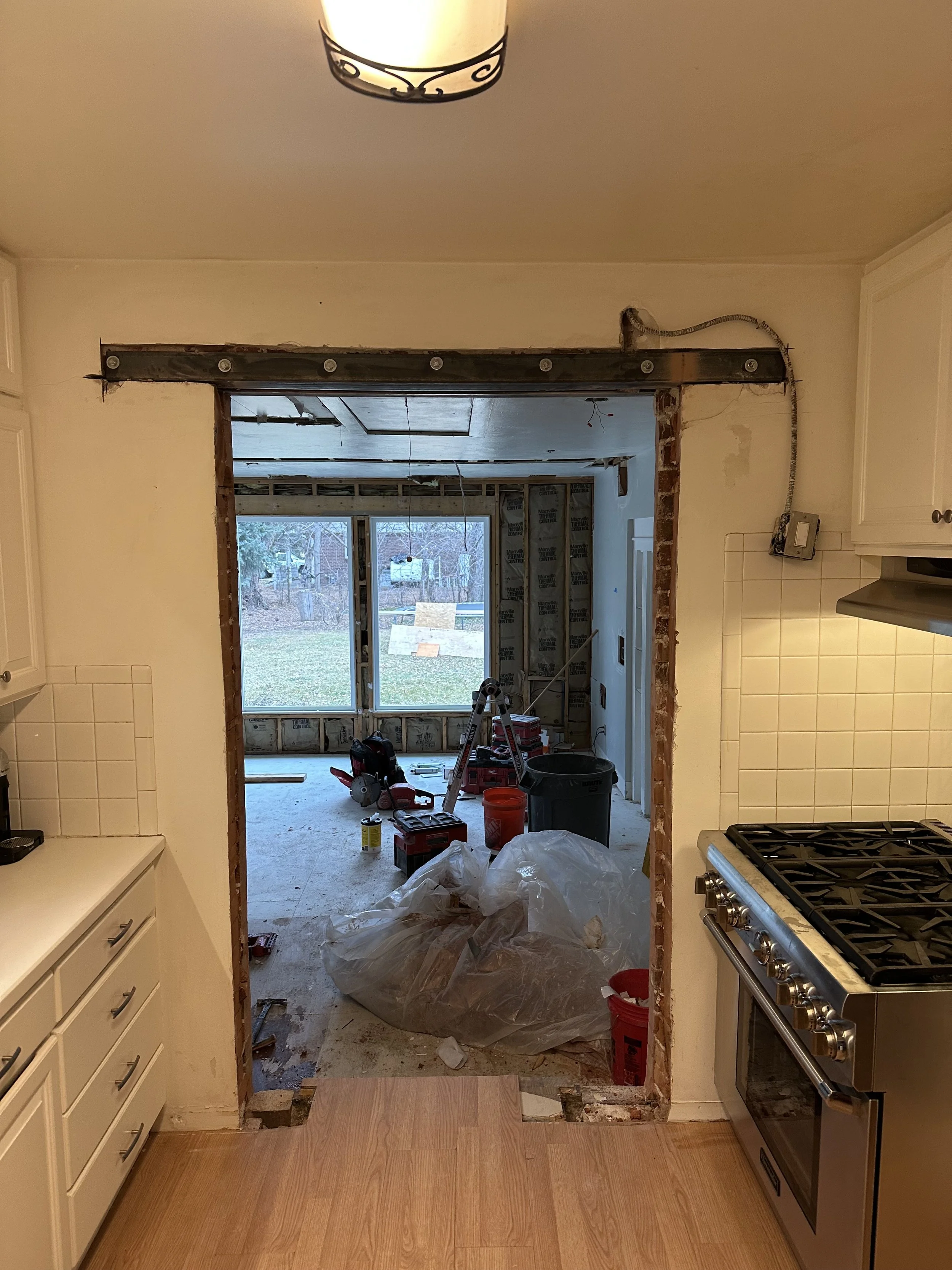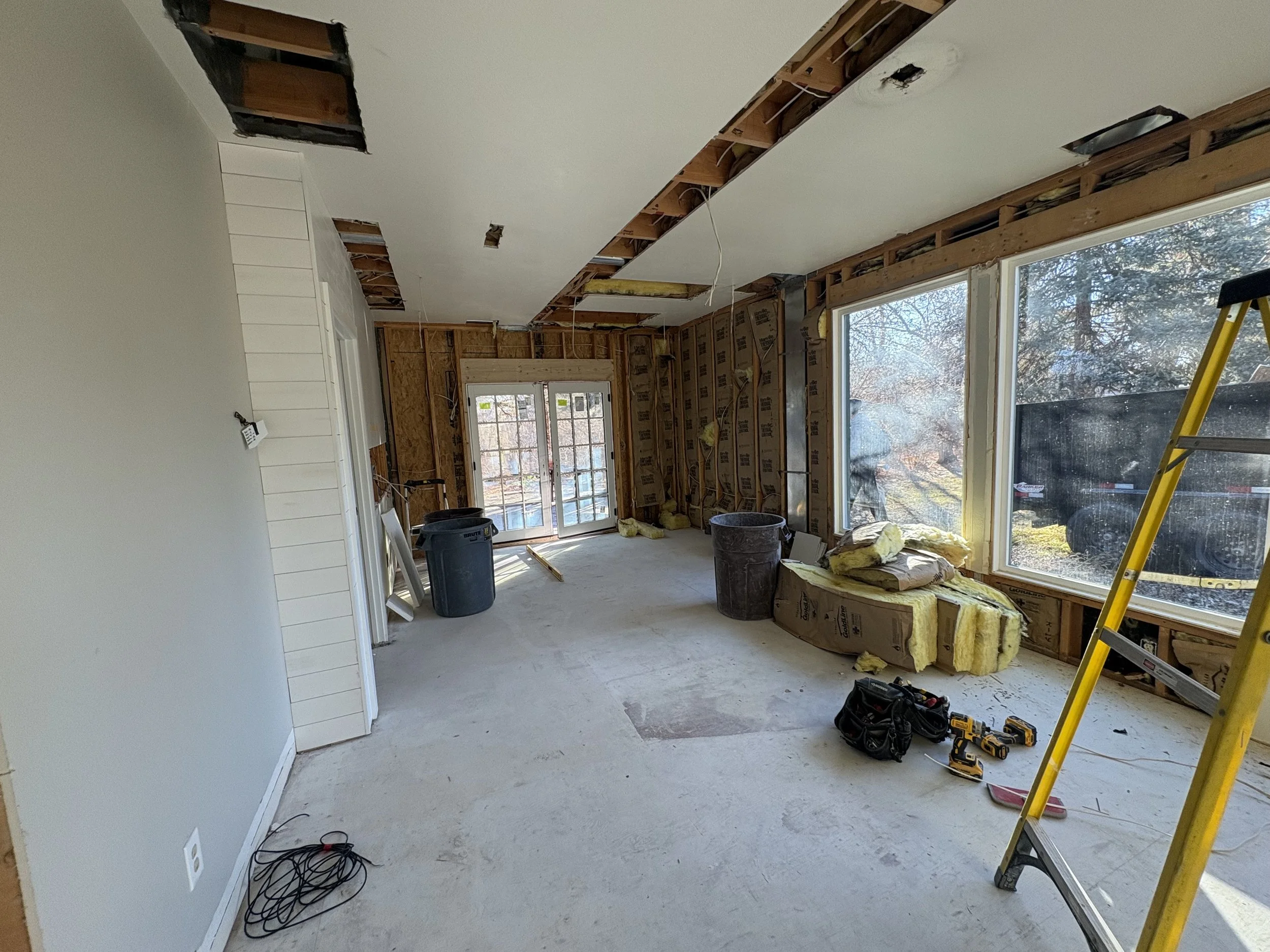 What was just the “back room,” once a sun porch off the original old farmhouse; it was a clutter staging ground for projects, plants, and animals… and also the client’s office, which had been wide open to this bigger back room (until we put a door up last year). The built-in lighting was all over the place without coherence, with huge, different, and outdated fixures. The carpet was impacted by many years of animals, so some light remediation was necessary. We’d been talking about upgrading the space for a good year, knowing we’d eventually get to the kitchen, so were thinking of creating a more inviting area with better light and flow between the kitchen and great room. In all honesty, we mostly knew what we were going for when we started, but it took some real-time design workshopping to dial things in.