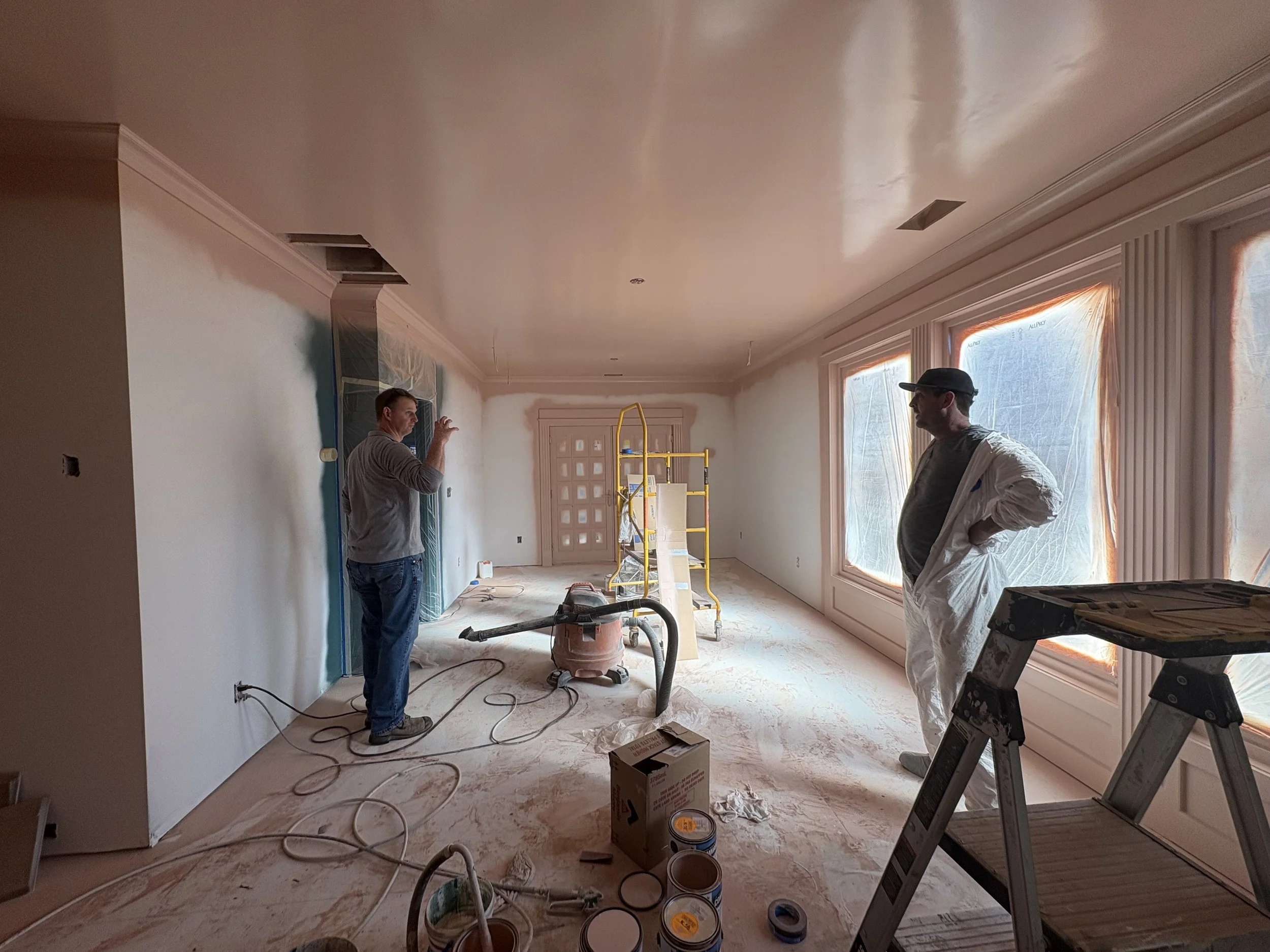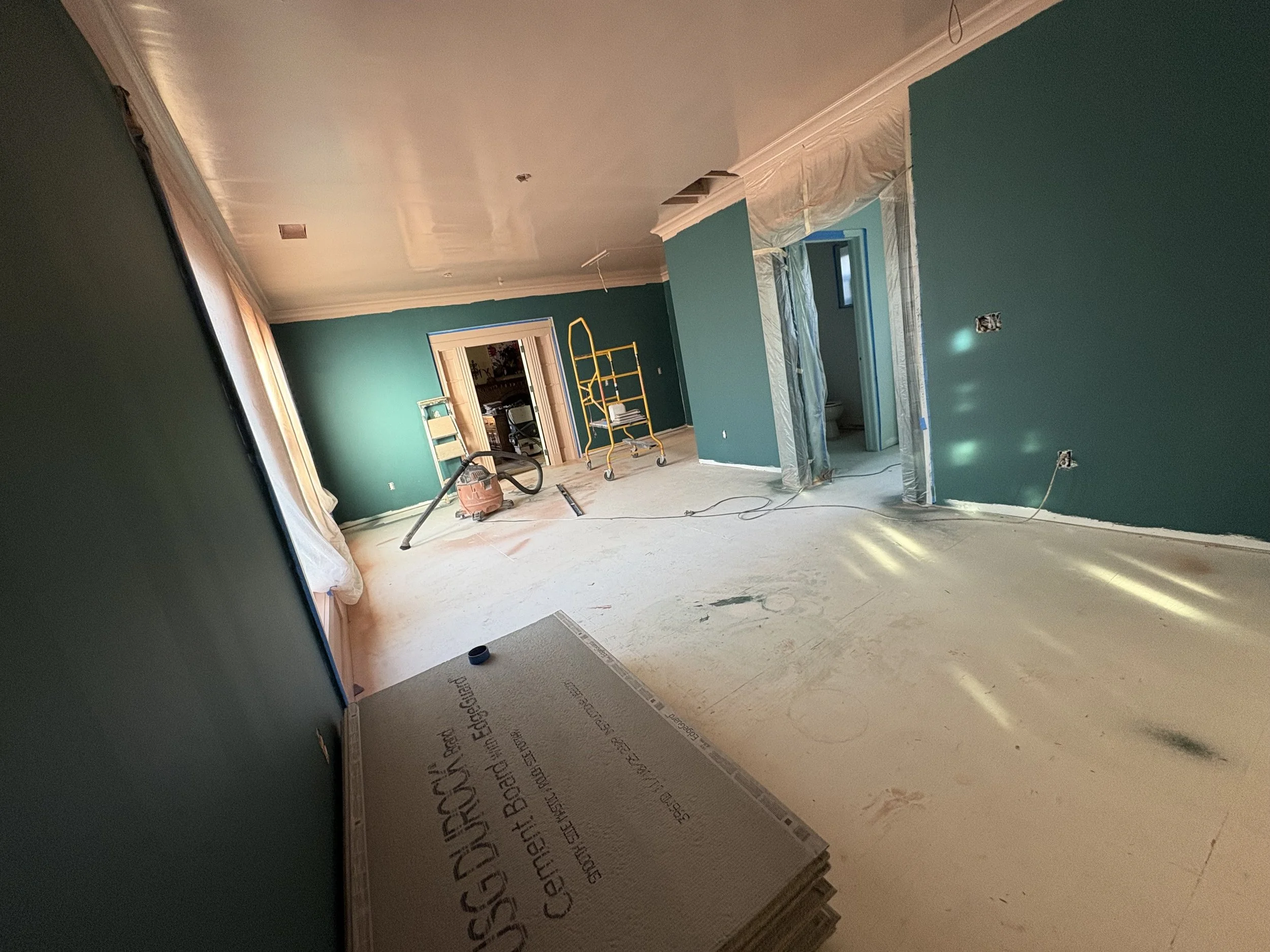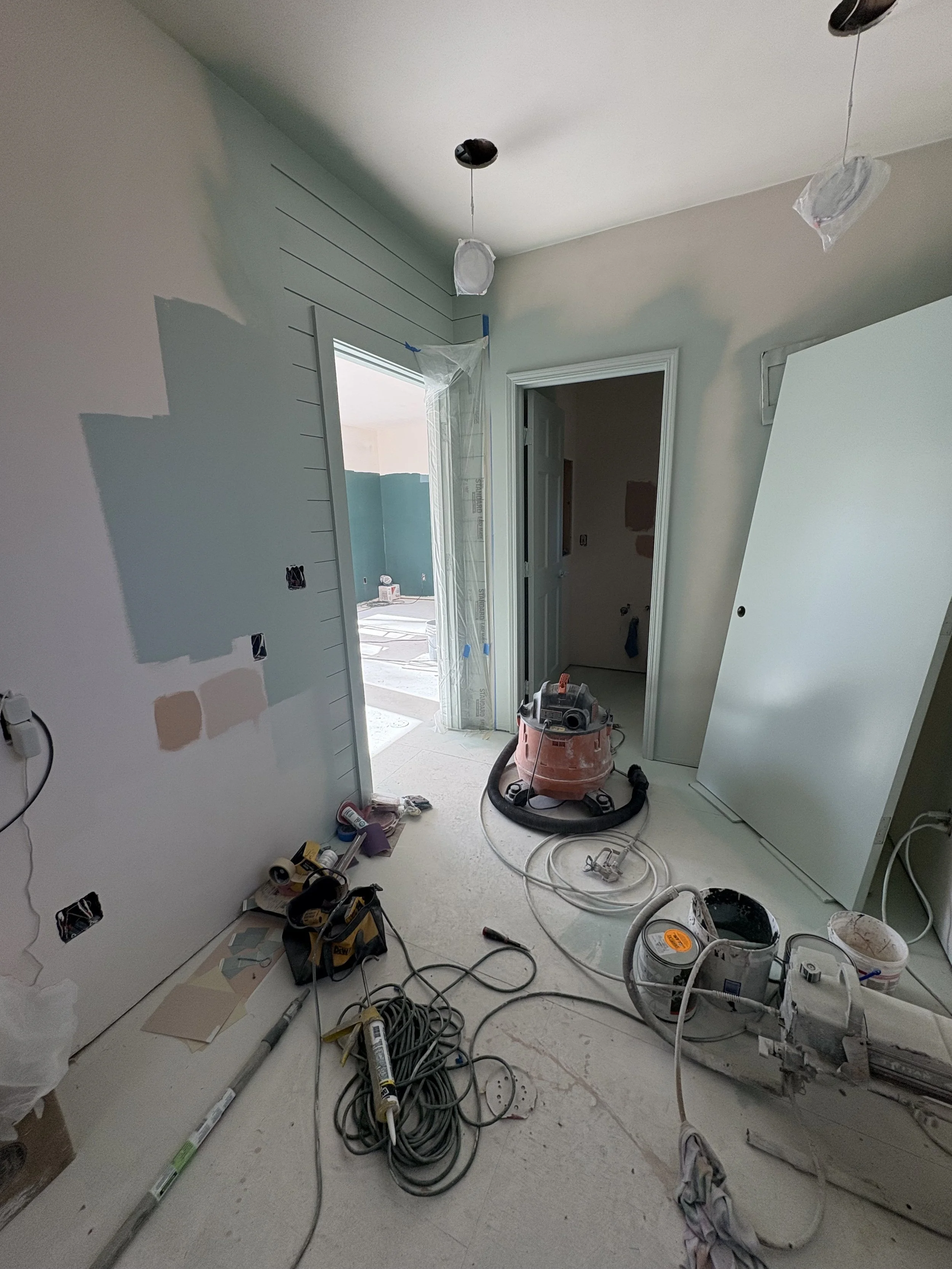 Project took about 8 weeks to complete 95%. Delays in shipping the light fixtures means we’ll come back in a few weeks to put them in (can’t wait!!). It’s the client’s new favorite room in the house, now! We can’t wait until they fully put it together and get some art on the walls, and have a party!