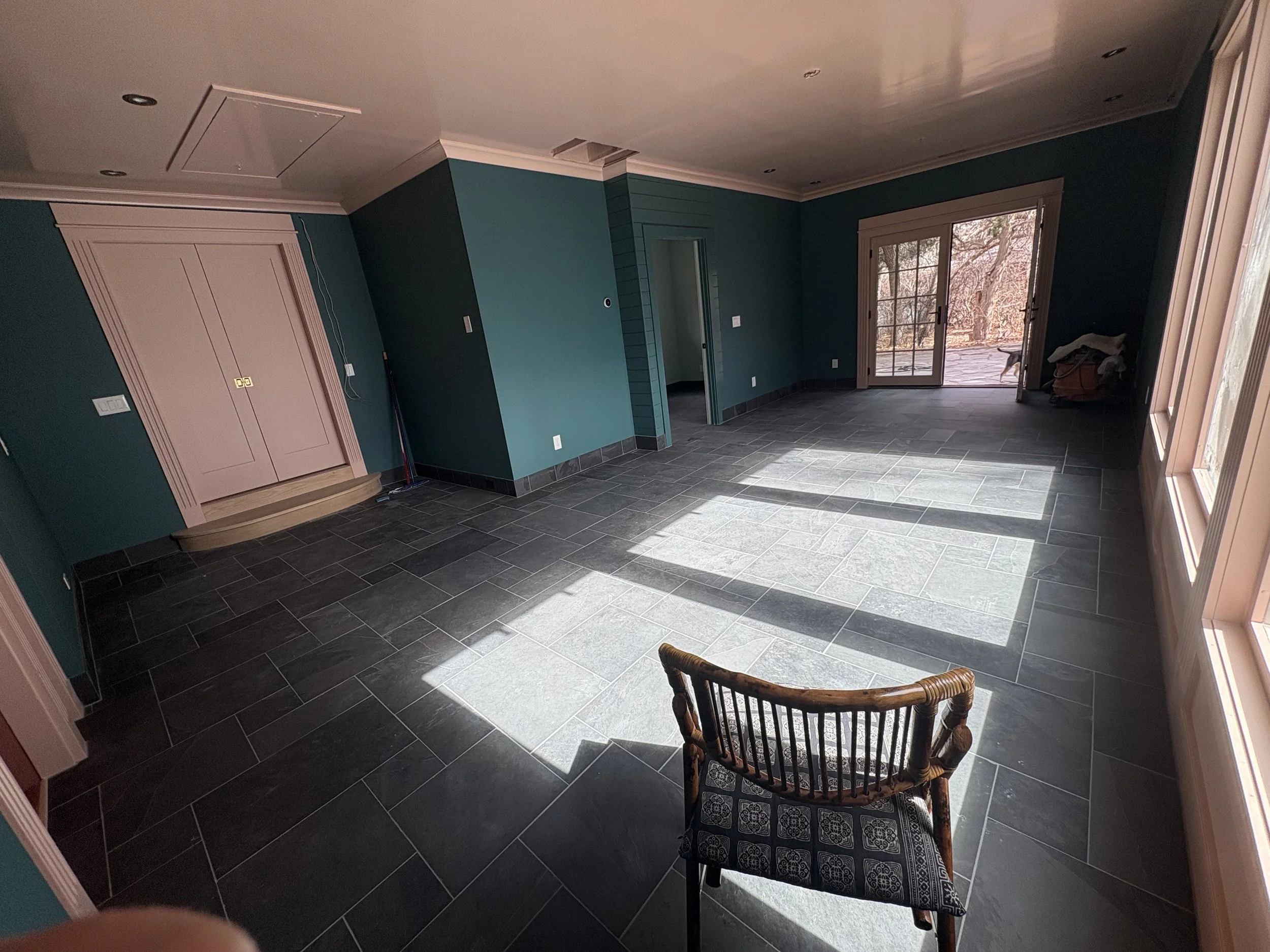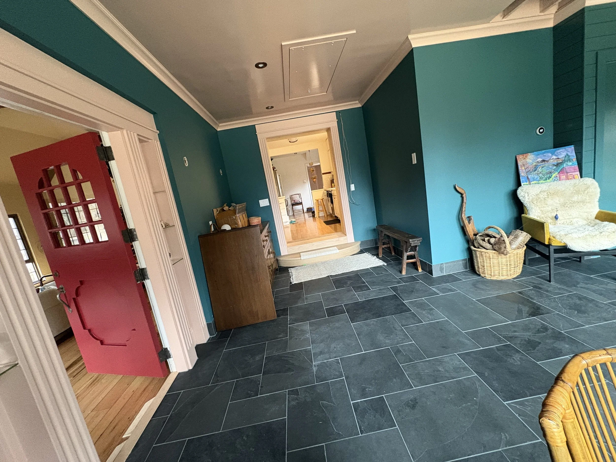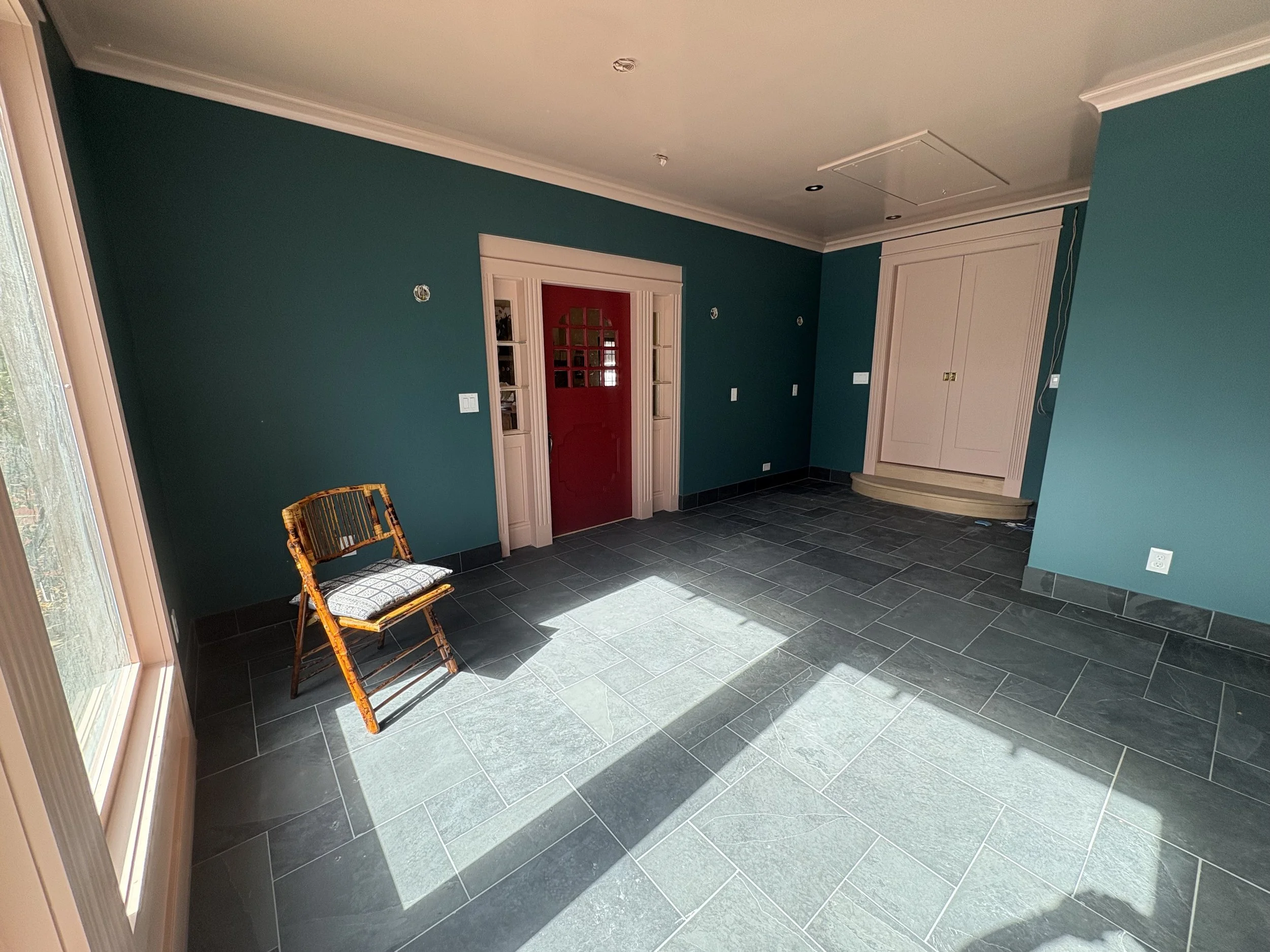 One can find “good enough” (even great!) tile at a place like Floor n Decor, surely… but artesian tile, especially in real earth materials, takes time to commit to, especially if there’s no local showroom and must resort to ordering (and paying) for samples. If you are committed to a special material, give yourself at least 3 months of dedicated searching and ordering samples on a regular basis. Give yourself a few hundred dollar budget to sort out the tile, paint, countertops etc. The tile in this home was researched & workshopped extensively, and everything we’ve installed so far, is amazing! On this project we used a natural slate in the Ashler pattern. Natural stone MUST be sealed, so make sure your tile installer knows how to work with it! Because the floor was sloped (and not worth the calculus to correct), our installer had to be very mindful of lippage (where the tile is meeting another tile; if there’s a difference in the plane, you’ll stub your toe). He back-buttered a little thicker is some places to make it work. A true artisan tile setter will know how to work with imperfect spaces for the highest possible results. There was only one location where the lippage was unavoidable, and he had to carefully grind down the high tile to align with the rest. The visual impact is not much different than the usual scuff marks that happen on softer, natural stone like slate, travertine, or even marble. If you want PERFECT surfaces, and will be driven INSANE by new scratches in the finish appearing, don’t go with natural stone floors!