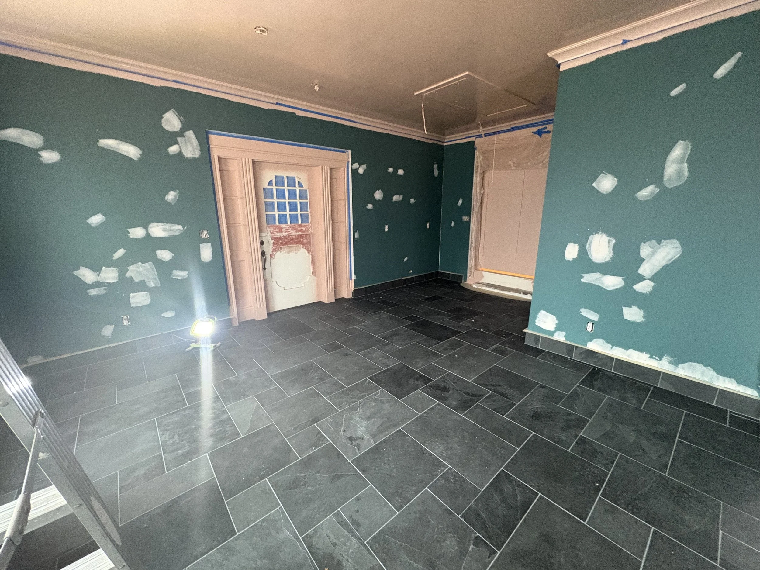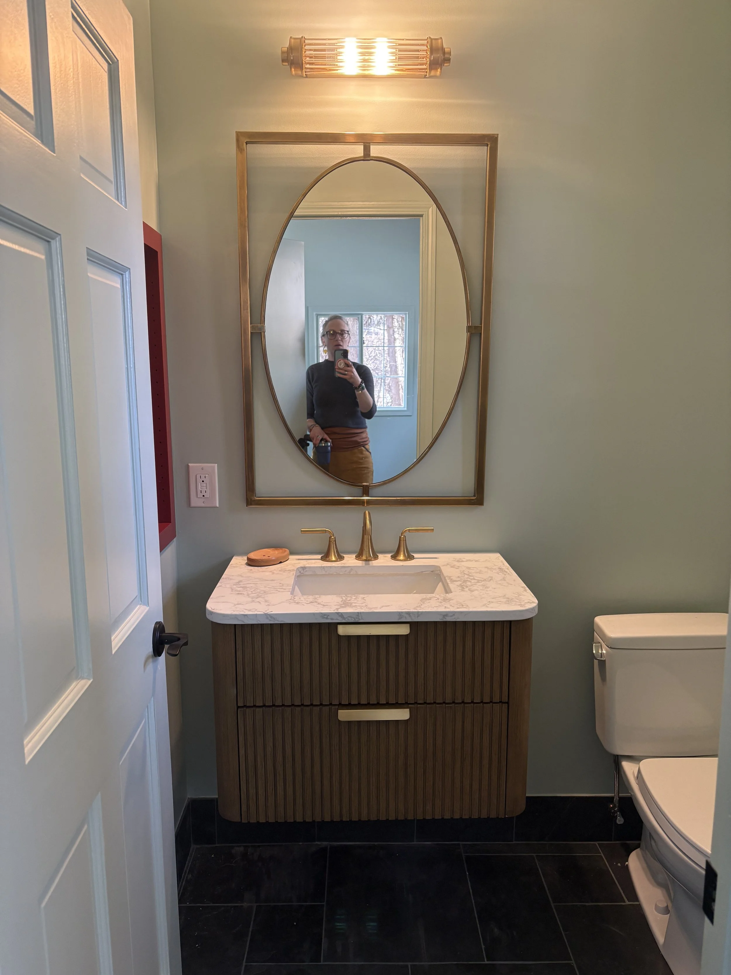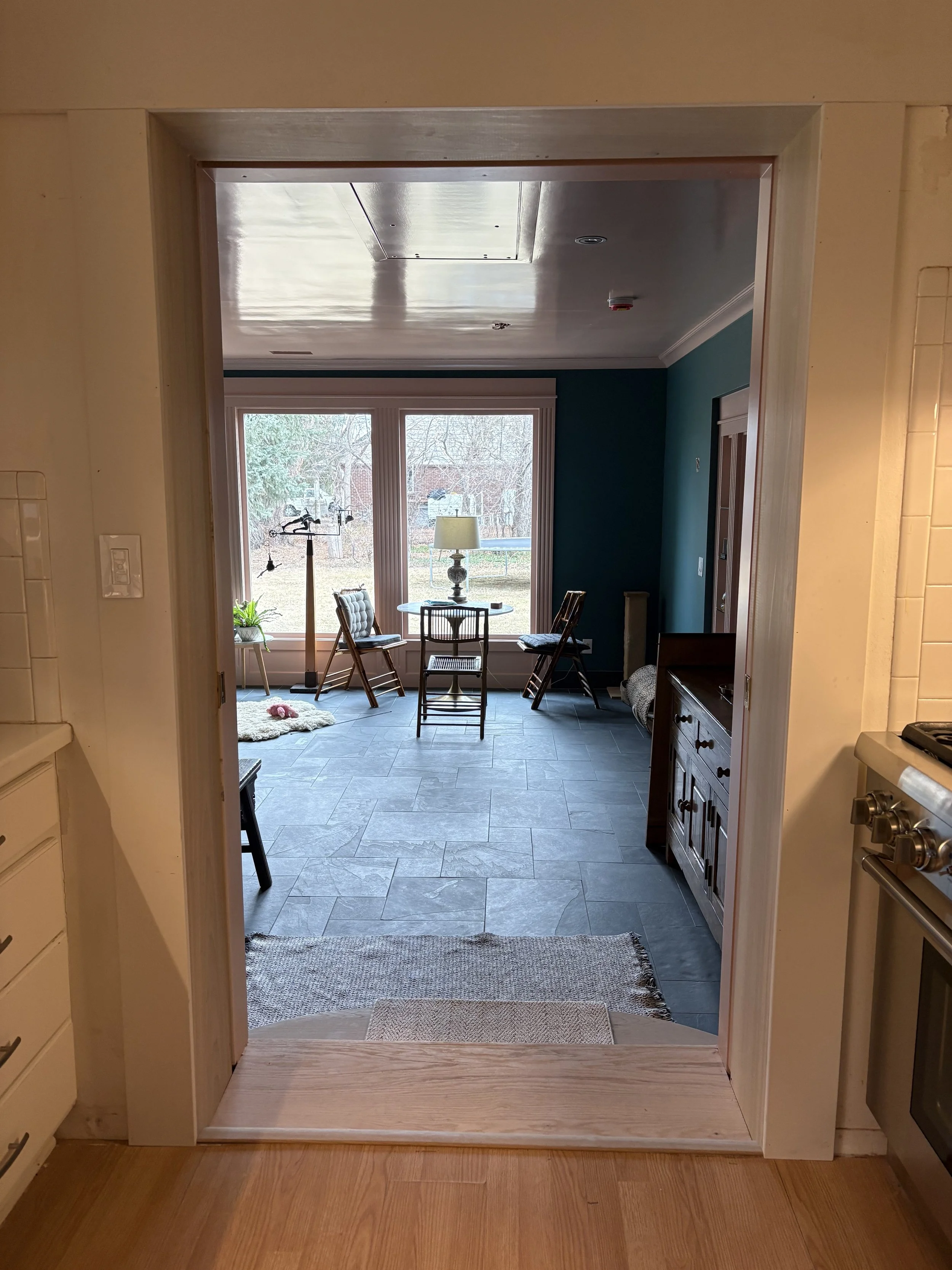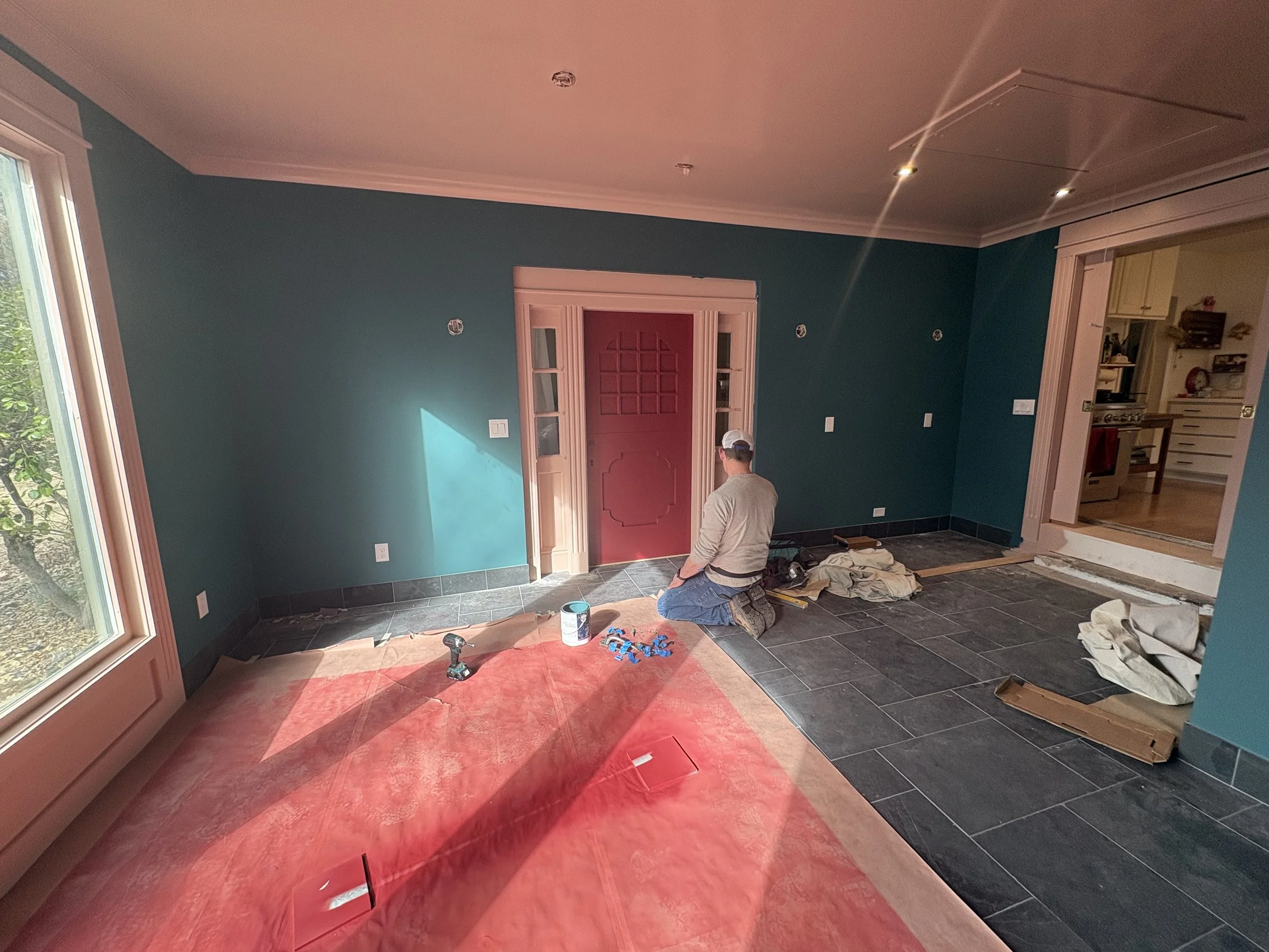 One can find “good enough” (even great!) tile at a place like Floor n Decor, surely… but artesian tile, especially in real earth materials, takes time to commit to, especially if there’s no local showroom and must resort to ordering (and paying) for samples. If you are committed to a special material, give yourself at least 3 months of dedicated searching and ordering samples on a regular basis. Give yourself a few hundred dollar budget to sort out the tile, paint, countertops etc. The tile in this home was researched & workshopped extensively, and everything we’ve installed so far, is amazing! On this project we used a natural slate in the Ashler pattern. Natural stone MUST be sealed, so make sure your tile installer knows how to work with it! Because the floor was sloped (and not worth the calculus to correct), our installer had to be very mindful of lippage (where the tile is meeting another tile; if there’s a difference in the plane, you’ll stub your toe). He back-buttered a little thicker is some places to make it work. A true artisan tile setter will know how to work with imperfect spaces for the highest possible results. There was only one location where the lippage was unavoidable, and he had to carefully grind down the high tile to align with the rest. The visual impact is not much different than the usual scuff marks that happen on softer, natural stone like slate, travertine, or even marble. If you want PERFECT surfaces, and will be driven INSANE by new scratches in the finish appearing, don’t go with natural stone floors!